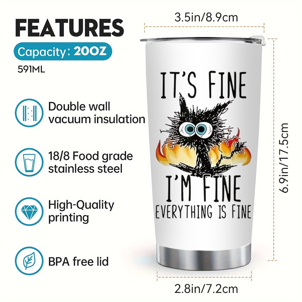 1pc 20oz Tired Cat Stainless Steel Insulated Car Cup, "IT'S FINE" English Letter Cup, The Best Birthday Gift For Workaholic Friends, Happy New Year