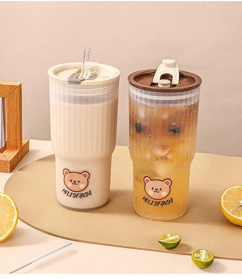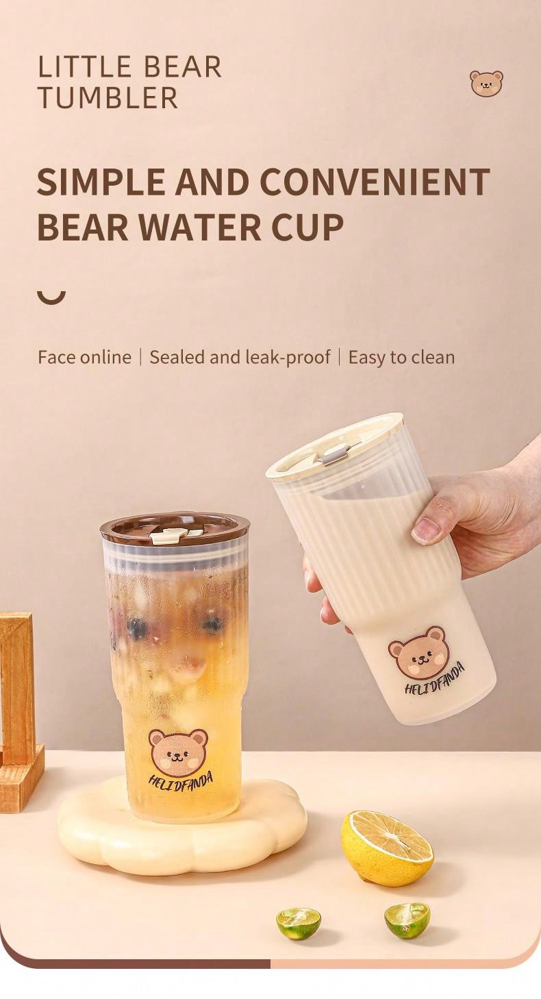 1pc 650ml Portable Transparent Plastic Water Cup With Lid, Cute Bear Pattern Leakproof Drink Coffee Mug, Suitable For Adults And Children To Go To School, Office And Traveling