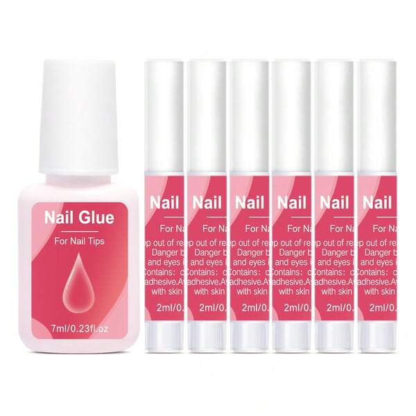 1pc 7ml Nail Glue Set + 6pcs 2ml Pink Acrylic Gel, Long Lasting & Super Strong Adhesive For Salon And Diy