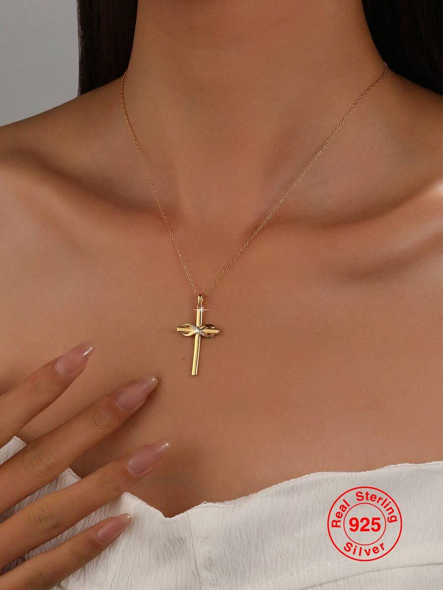 1pc 925 Sterling Silver Cross Pendant Necklace With Zirconia For Women, Simple Design And Versatile Jewelry Gift