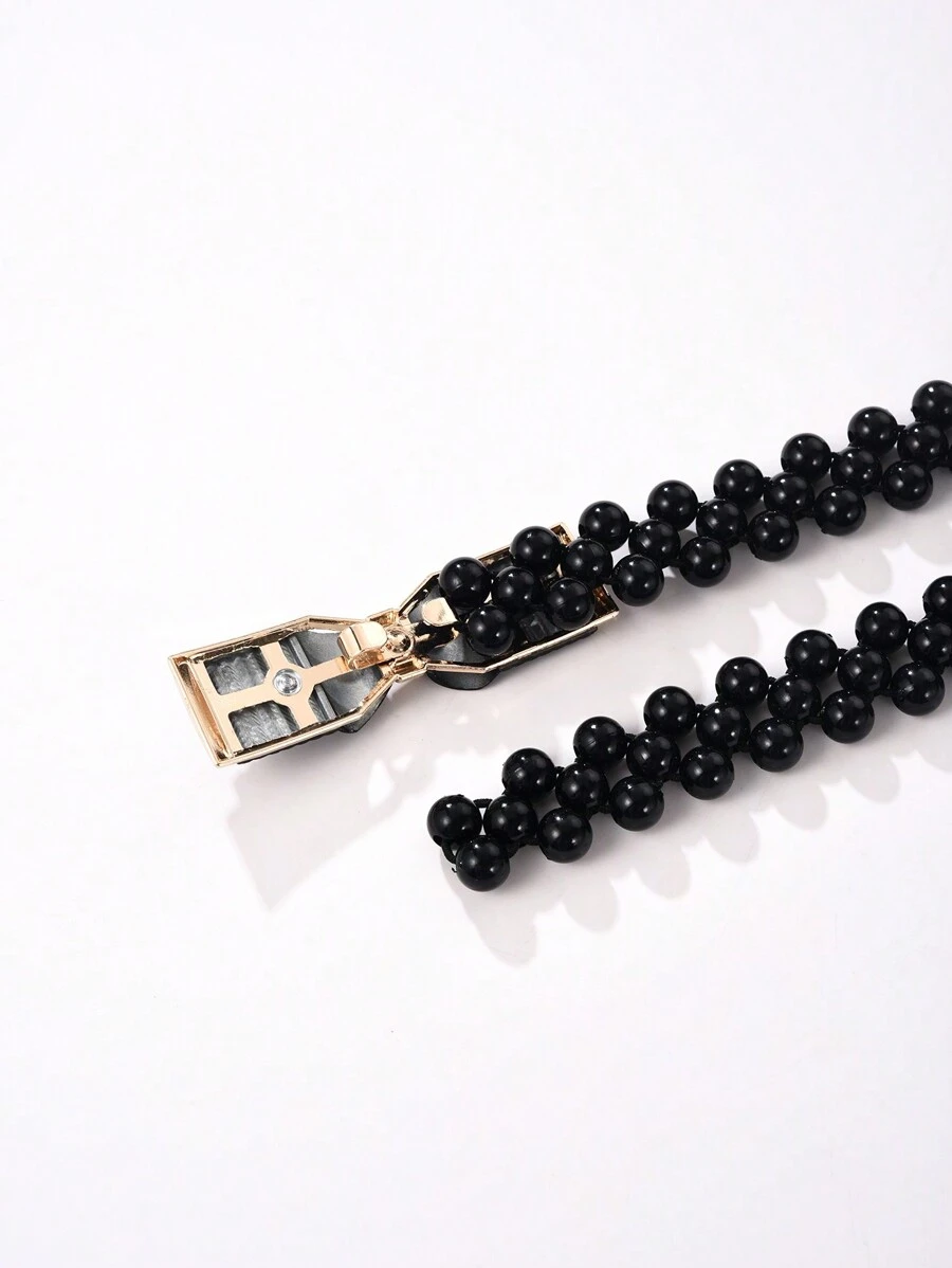 1pc Adjustable Length Elastic 3 Rows Of Faux Black Pearls Women'S Waist Chain Diamond Embellished Rose Bud Alloy Buckle Dress Decorative Belt