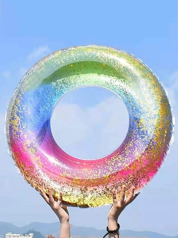 1pc Adult/Kid Rainbow Gradient Inflatable Swimming Ring With Flashing Sequins