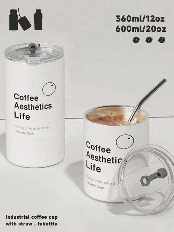 1pc American-style Cold Brew Coffee Cup, 360ml/600ml, Portable For Office, Insulated, Stainless Steel, Large Capacity, With Drinking Straw