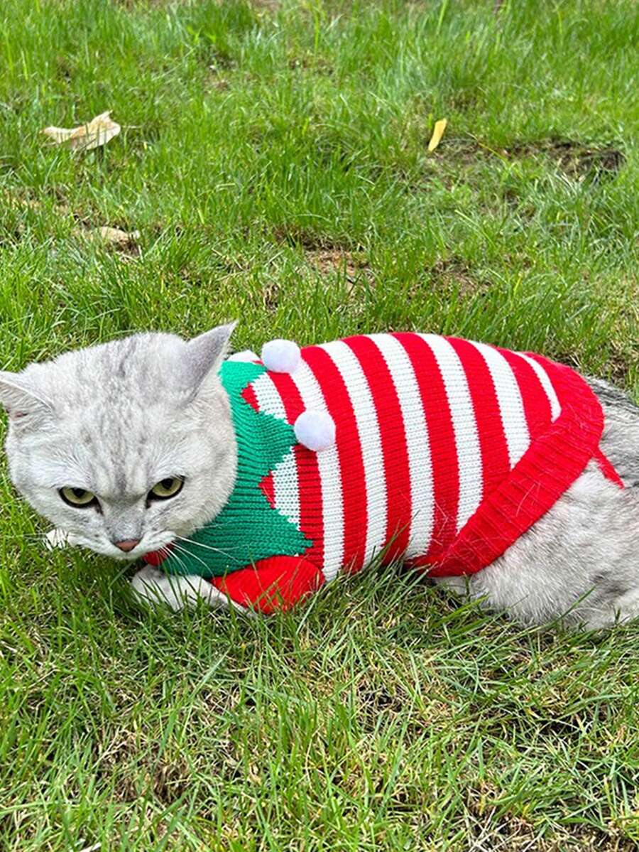 1pc Autumn & Winter Pet Knitted Sweater With Red & White Stripes And Green Scarf And Ball Detail Suitable For Cats And Dogs As Festival Clothes