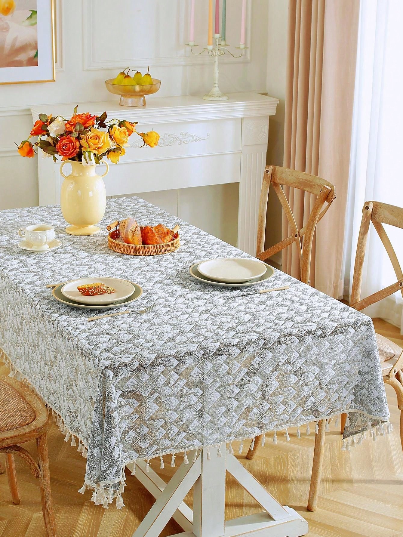1pc Autumn/Winter Mountain Range Pattern Lace Grey And White Tablecloth With Tassels And Dust Cover Cloth For Coffee Table And Piano, Suitable For Farmhouse Home Dining Table, Festive Dinner, Party, Banquet, Wedding Decoration, Rectangular Tablecloth
