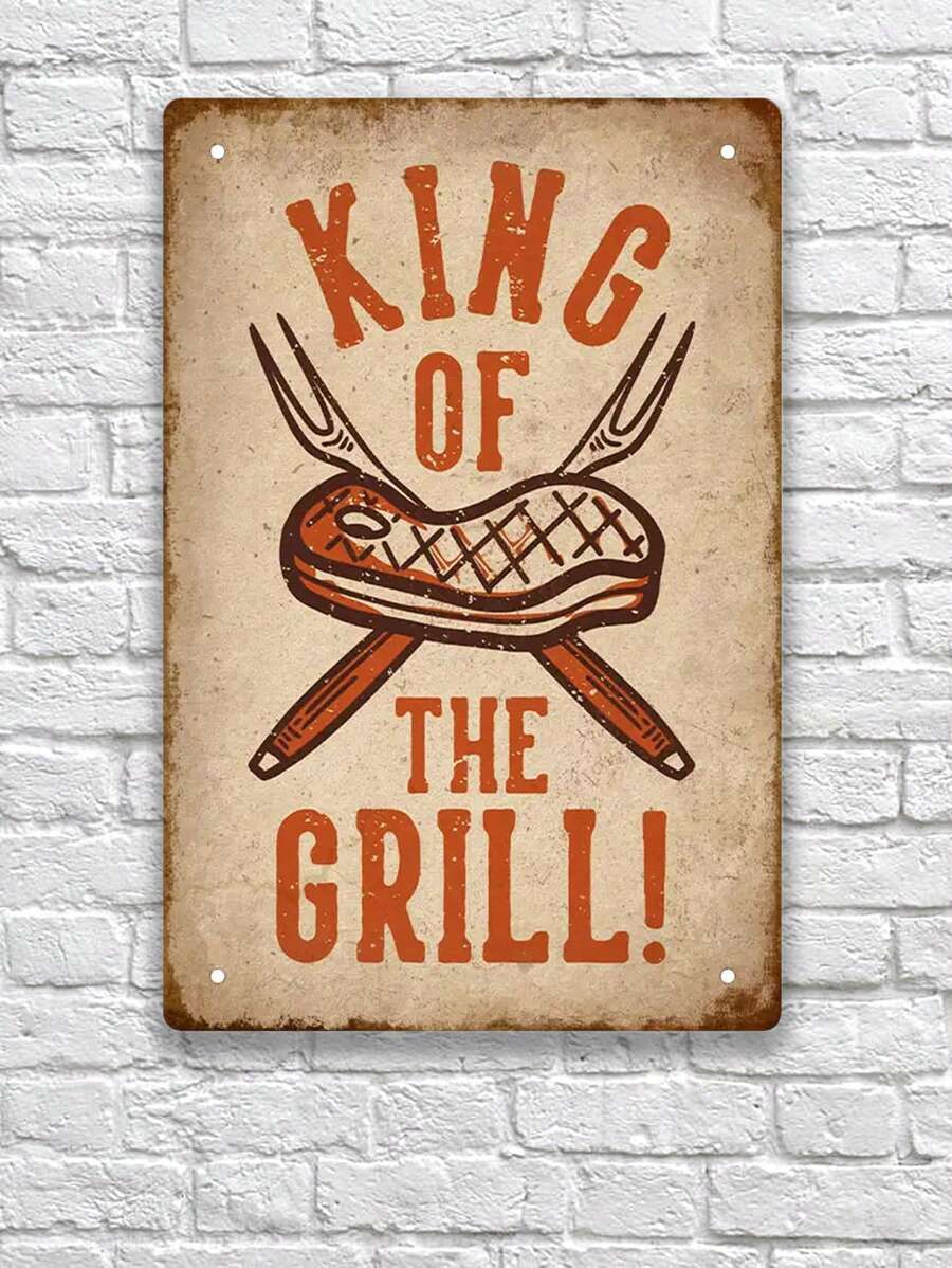 1pc BBQ Metal Tin Sign, King Of The Grill Barbecue Poster Painting, Vintage Plaque Wall Art Decor For Restaurant Backyard Patio Porch Man Cave, 7.9 X 11.8 Inches