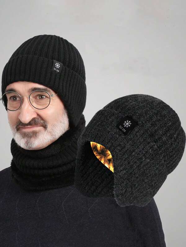 1pc Black Knitted Wool Hat With Lining, Warm Winter Beanie With Ear Flaps For Men And Women