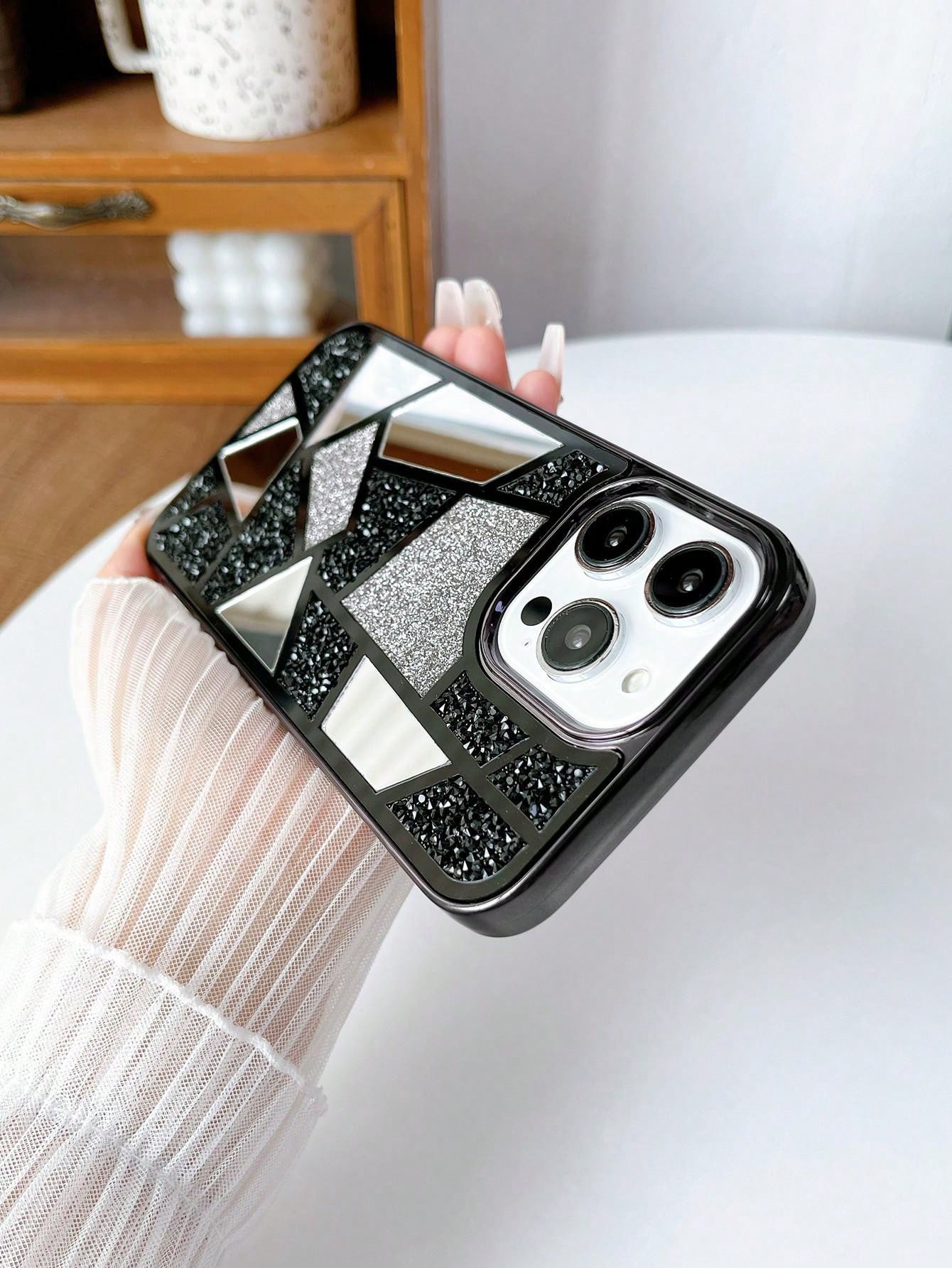 1pc Black Mirror Finish Geometric Multi-color Sparkling Diamond Phone Case For Iphone 15 Pro Max