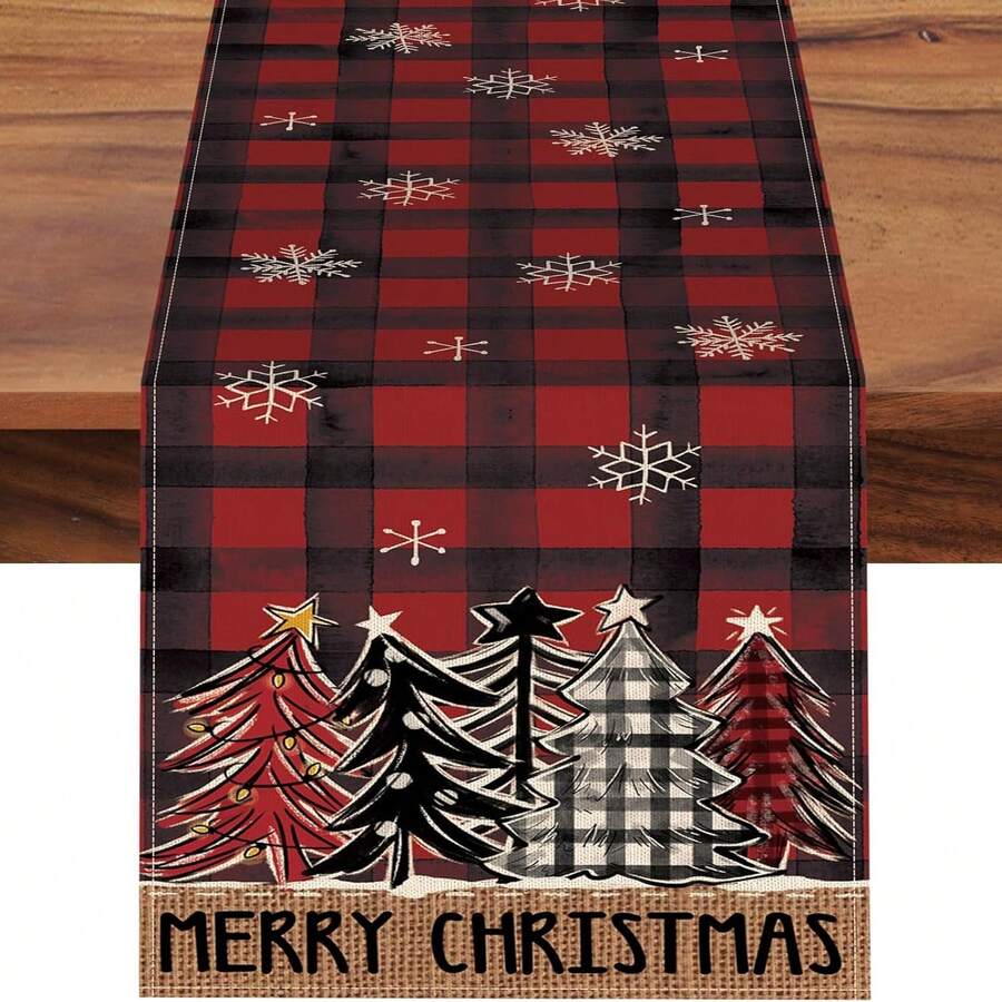 1pc Black & Red Plaid Christmas Tree & Snowflake Christmas Table Runner, Farmhouse Kitchen Dining Table Decor, Indoor Outdoor Home Decoration, Party Supplies, Size: 13x35/13x47/13x72/13x90/13x108 Inches, Winter Holiday