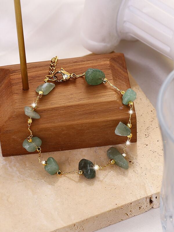 1pc Bohemian Beach Style Fashionable Double-layer Stainless Steel Bracelet With Irregular Green Stones For Women (size Of Stones Vary)