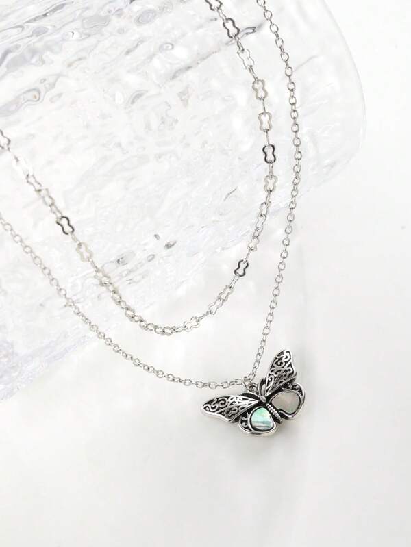 1pc Bohemian Style Vintage Zinc Alloy Butterfly & Flower Pattern With Shell Double Layer Necklace In Antique Silver, Suitable For Women'S Daily Wear And As A Gift For Girlfriend