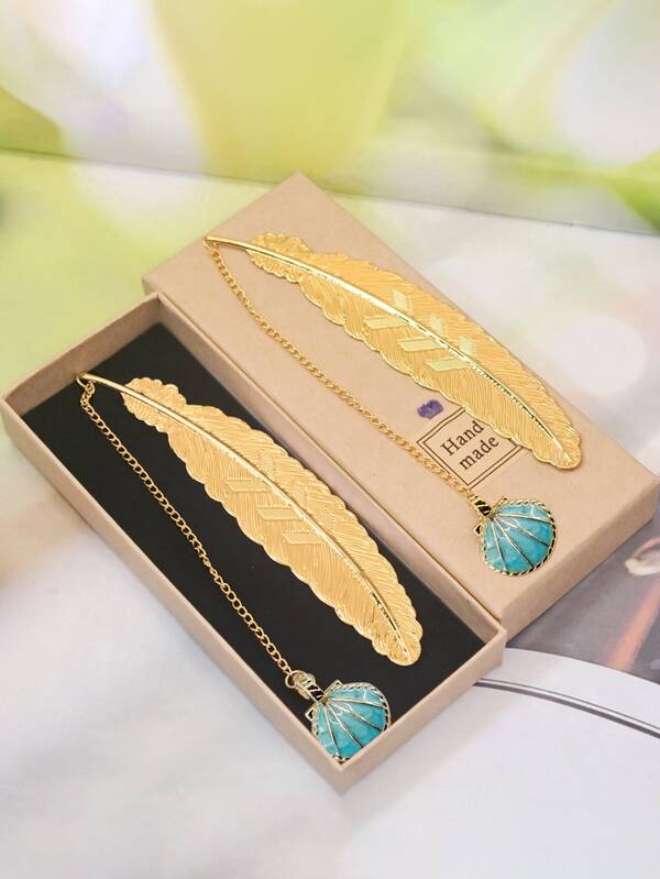 1pc Brass Feather & Leaf Vein Bookmarks With Blue Shell Decoration