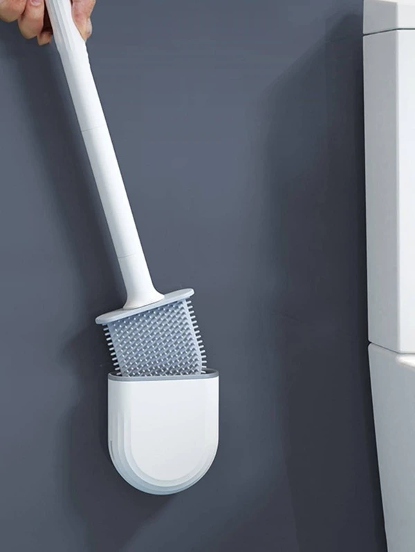 1pc Breathable Toilet Brush Water Leak Proof with Base Silicone WC Flat Head Flexible Soft Bristles Brush with Quick Drying Holder