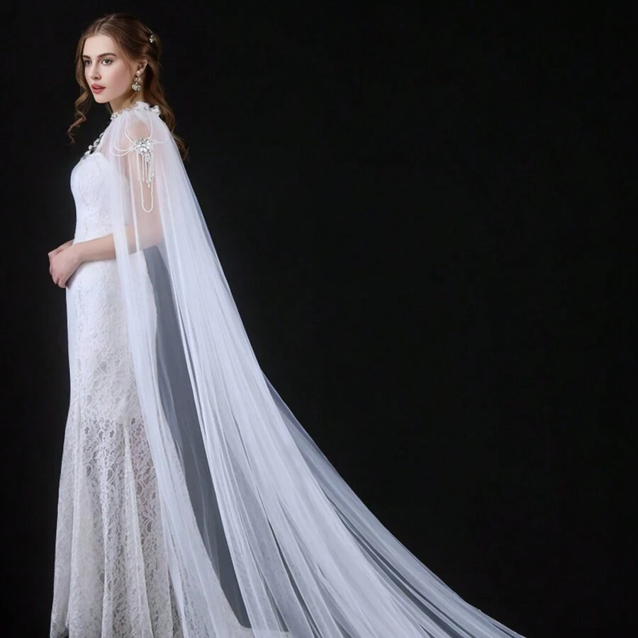 1pc Bridal Shawl With Pearls, Pearl Tulle Wedding Cape For Wedding Party Show