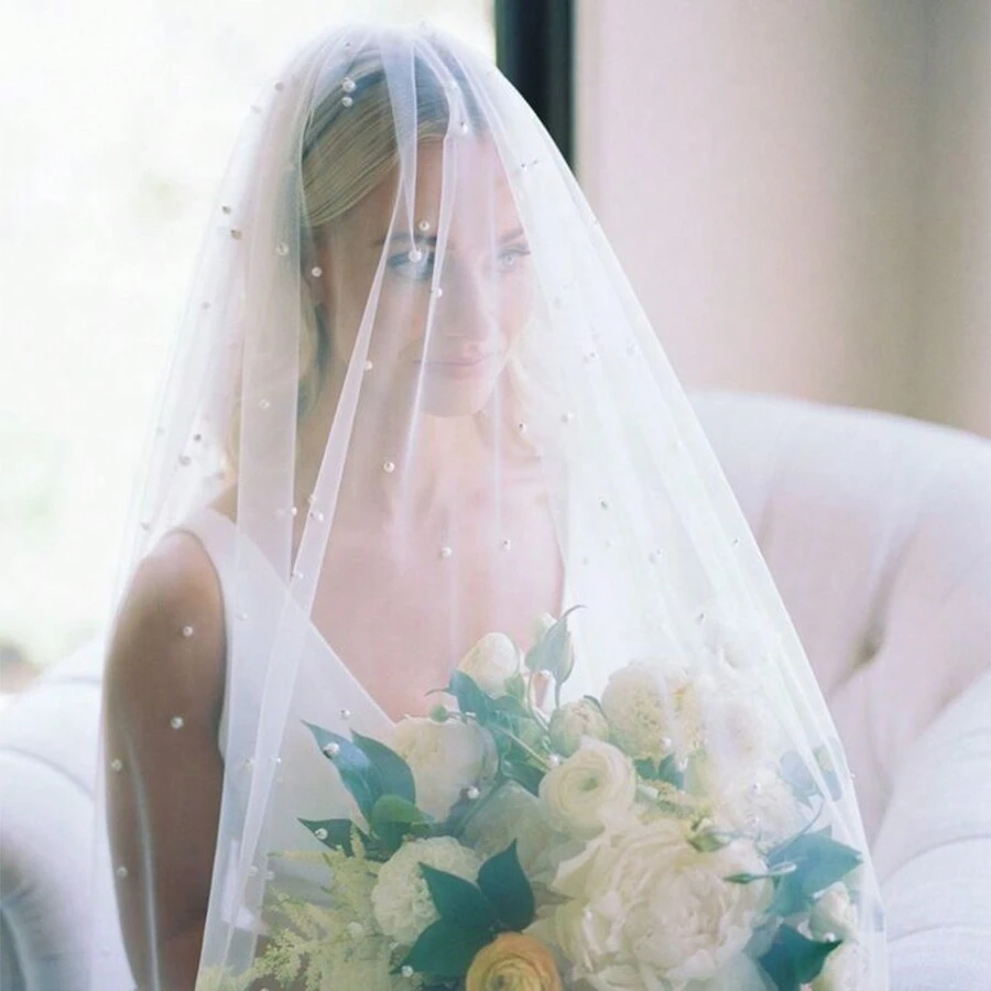 1pc Bridal Veil With Double-Layered Tulle & Pearl Embellishments For Wedding Photoshoot
