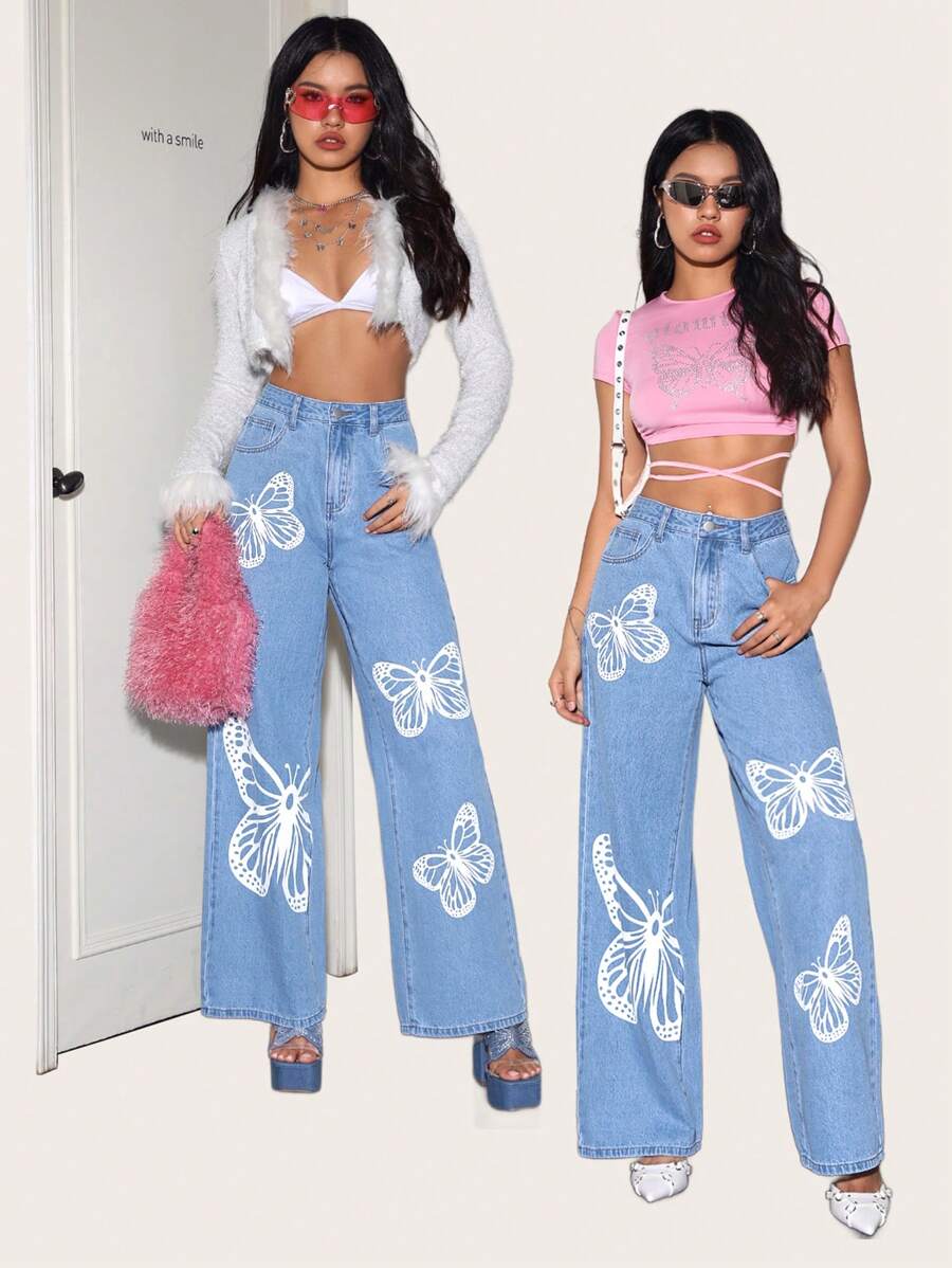 SHEIN 1pc Butterfly Print Wide Leg Jeans
