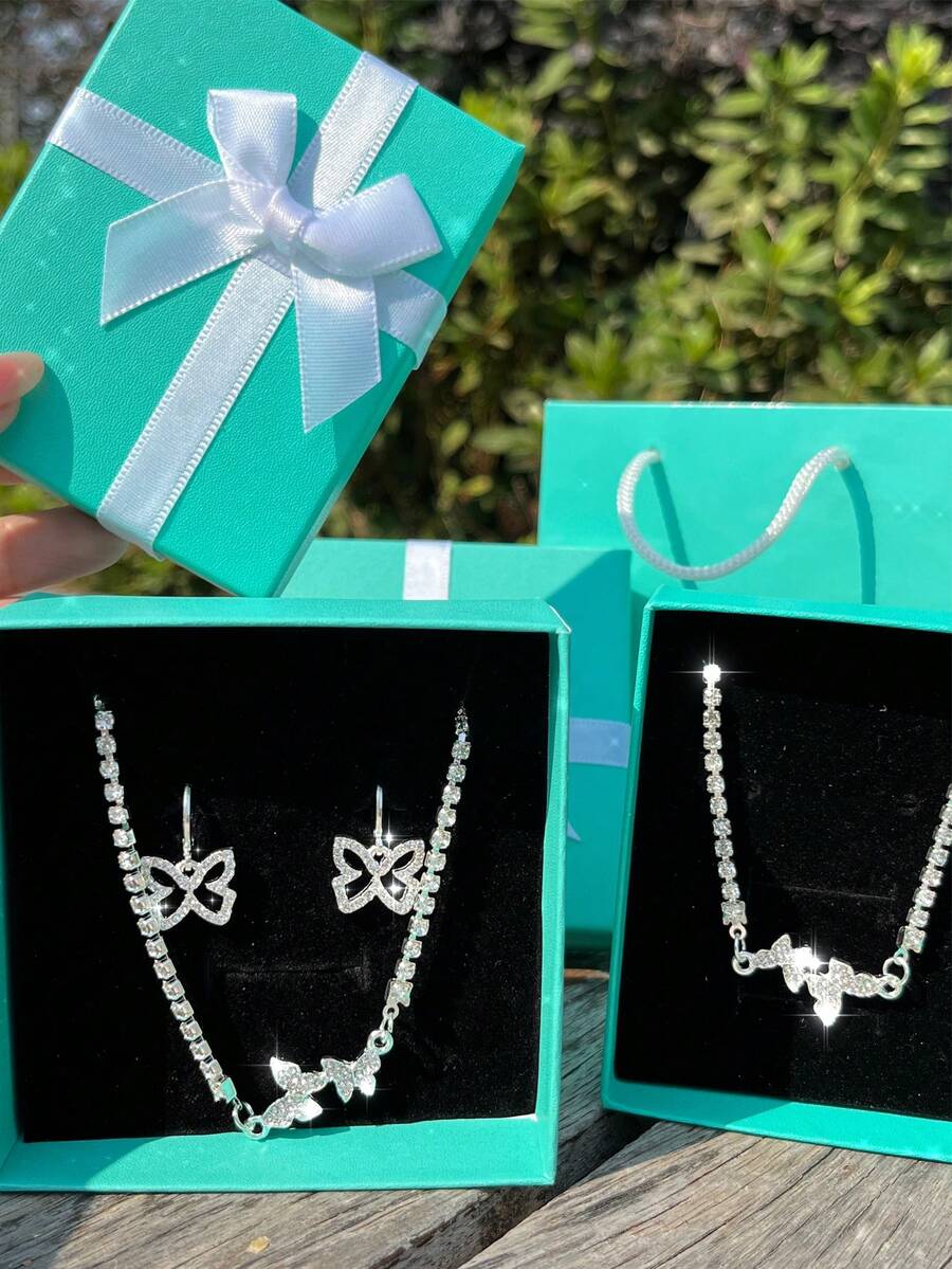1pc Butterfly Shaped Necklace, 1pair Earrings, 1pc Bracelet & 1pc Jewelry Box Included, 1set Crystal Wedding Jewelry, A Good Gift For Girlfriend On Festival