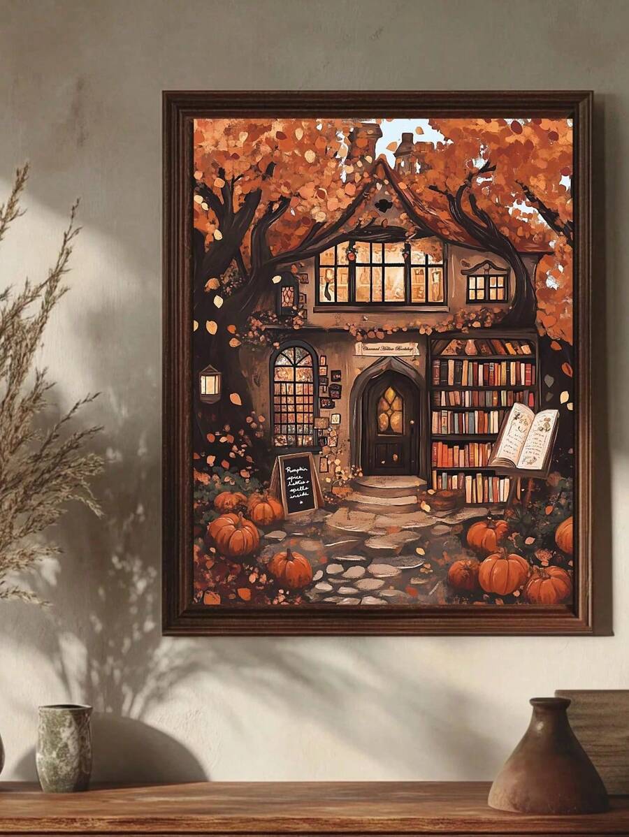 1pc, Canvas Hanging Painting, Framed Art Decoration, Ready To Hang, Wall Arts, Posters, Wall Art With Frame, Fantasy Bookstore Art, Fall Decoration, Rustic Fall Decoration, Halloween Wall Art, Vintage Halloween Paintings, Melancholic Fall Prints, Dark Preppy Fall Posters, Doorway Pumpkin Decoration, Maple Leaves, Fall, Halloween, Halloween Room Decoration, Halloween Dorm Decoration, Wall Decoration