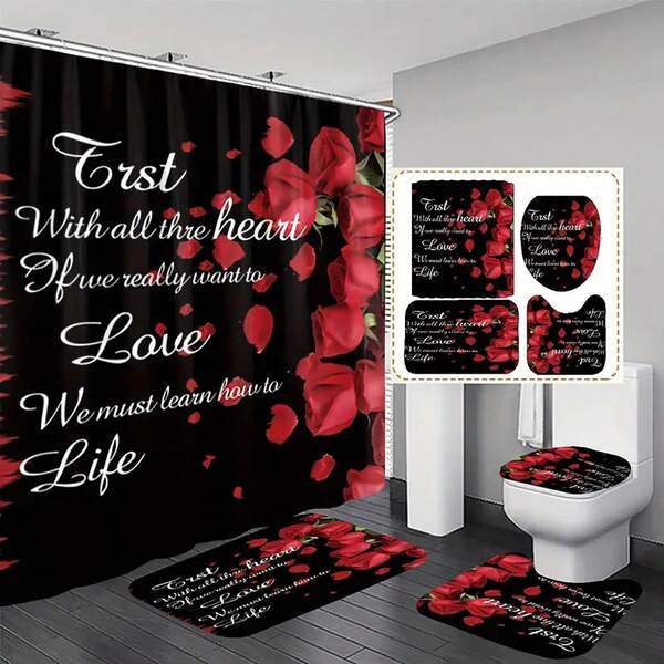 1pc Cartoon Valentine'S Day Themed Shower Curtain, Made Of Polyester Fiber And Comes With 12 Hooks, Water-Resistant Polyester Fabric. It Also Includes A Soft Absorbent Non-Slip Bathroom Mat For Home Use