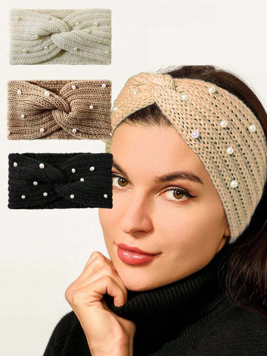 1pc Casual Knitted Headband In Khaki, Winter Women's Headbands Bundle Knitted Headband Headscarf, High-Class Soft Wide Headwrap, Rhinestone Embellished Headband In Knit Crossed Headwear, Chic Pearl-Decorated Hair Accessory
