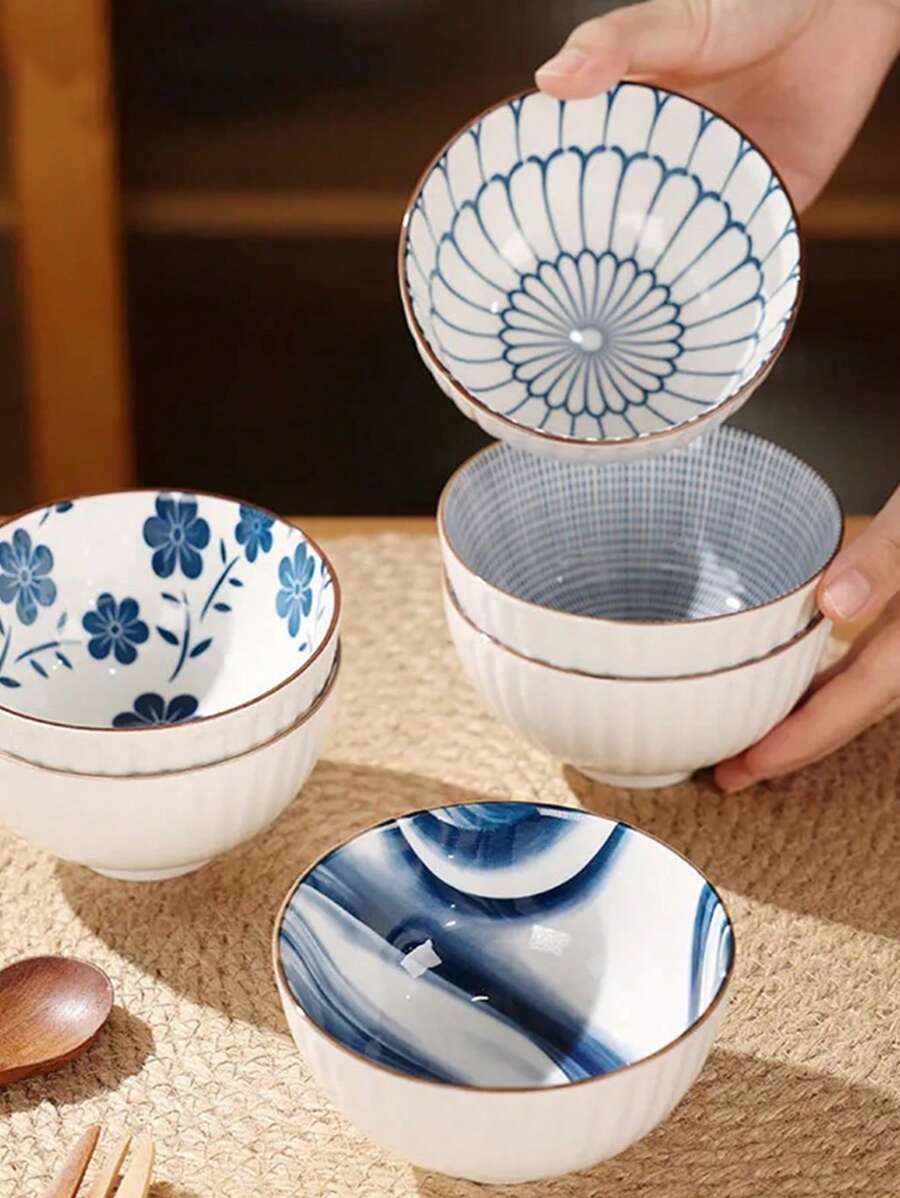 1pc Ceramic Bowl For Home Use, With Geometric Patterns And Blue & White Porcelain Design For Rice, Soup Or Other Food