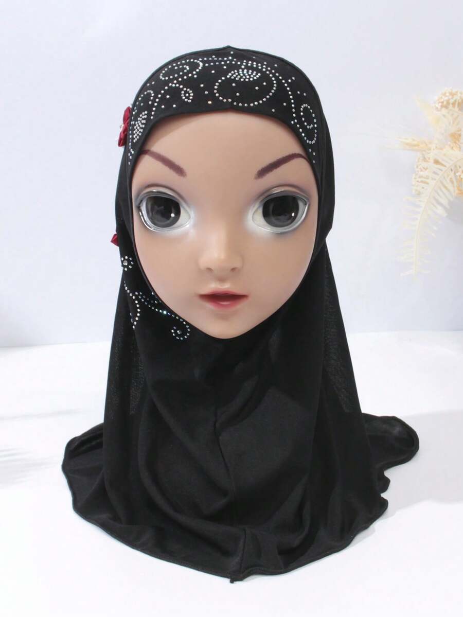 1pc Children's Black Rhinestone & Flower Decor Sunproof, Warm-keeping, Protective, And Simple Headscarf Suitable For Outdoor Activities And Daily Use