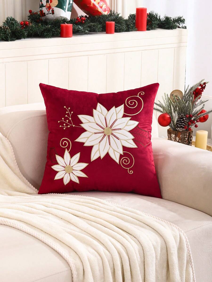 1pc Christmas Decorative Pillowcase Velvet Christmas Flower Embroidery
