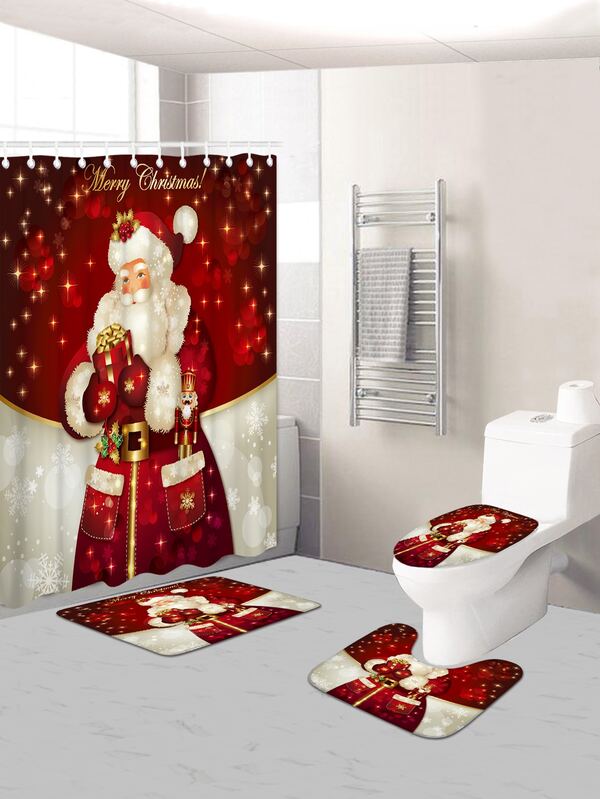 1pc Christmas Santa Print Bath Rug Or 1pc Shower Curtain