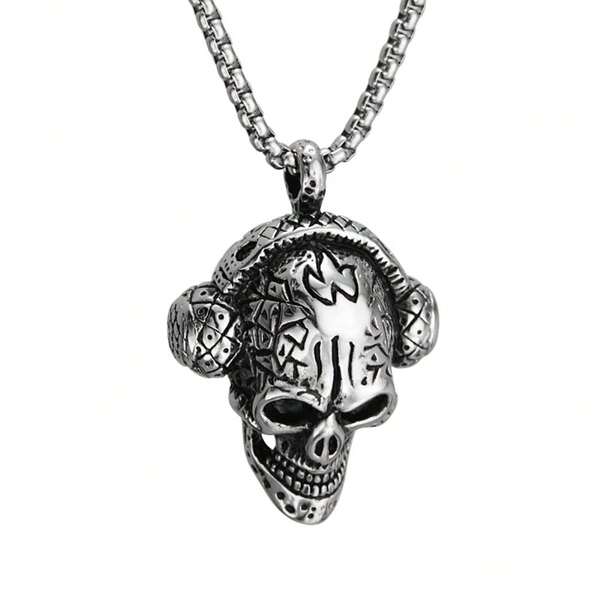 1pc Creative Hip-Hop Style Earphone Wearing Skull Pendant Stainless Steel Chain Necklace, Cool For Nightclub, Party, Bar, Motorcycle, Halloween Accessories