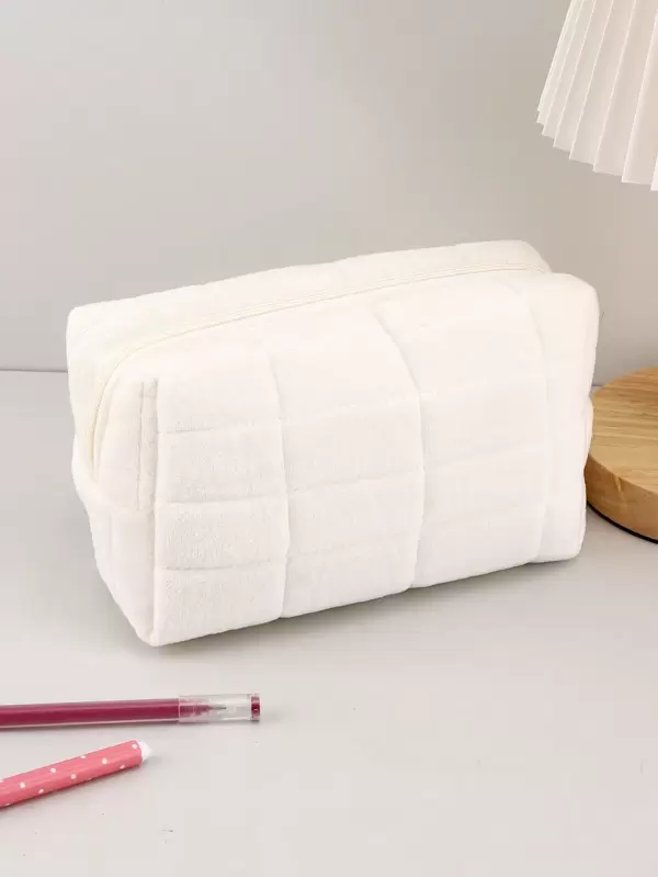 1pc Creative Plaid Design Pencil Case With Zipper, Solid Color Plush Pencil Bag, Large Capacity Student Stationery Box
