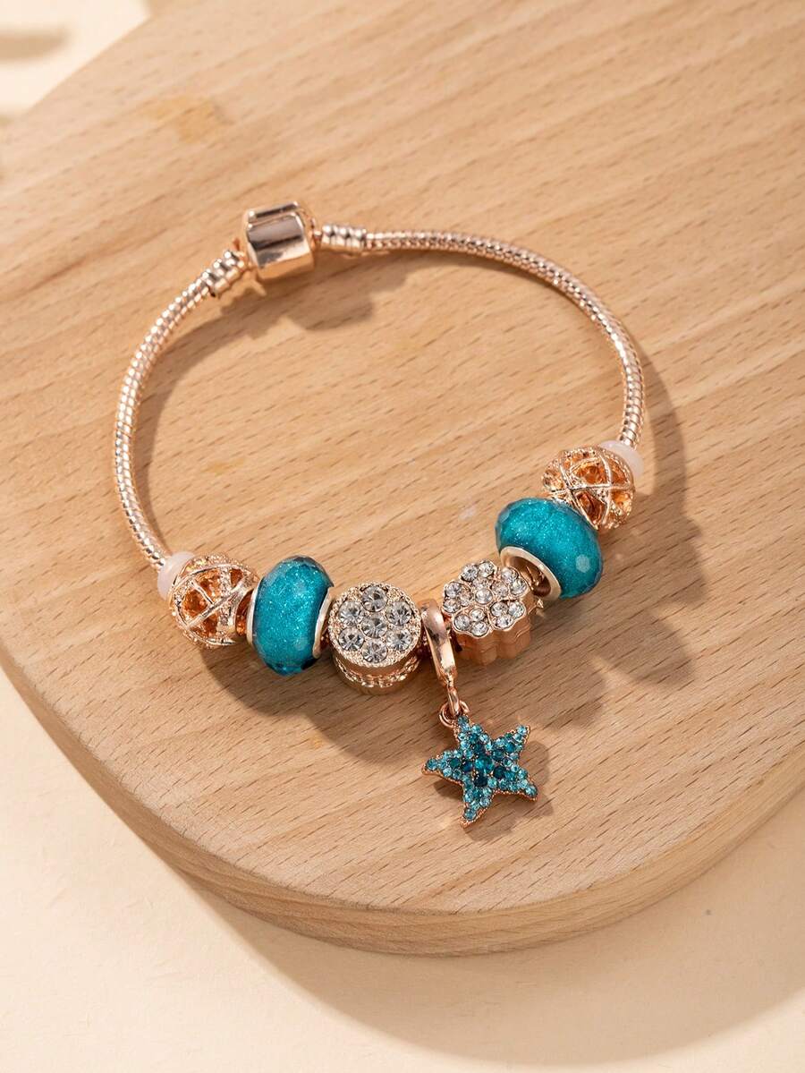 1pc Crystal & Rhinestone Flower Shaped Metallic Charm & Blue Crystal Beads & Rhinestone Starfish Pendant Copper Bracelet Women's Luxury & Lovely & Fashionable Jewelry For Dating Gift