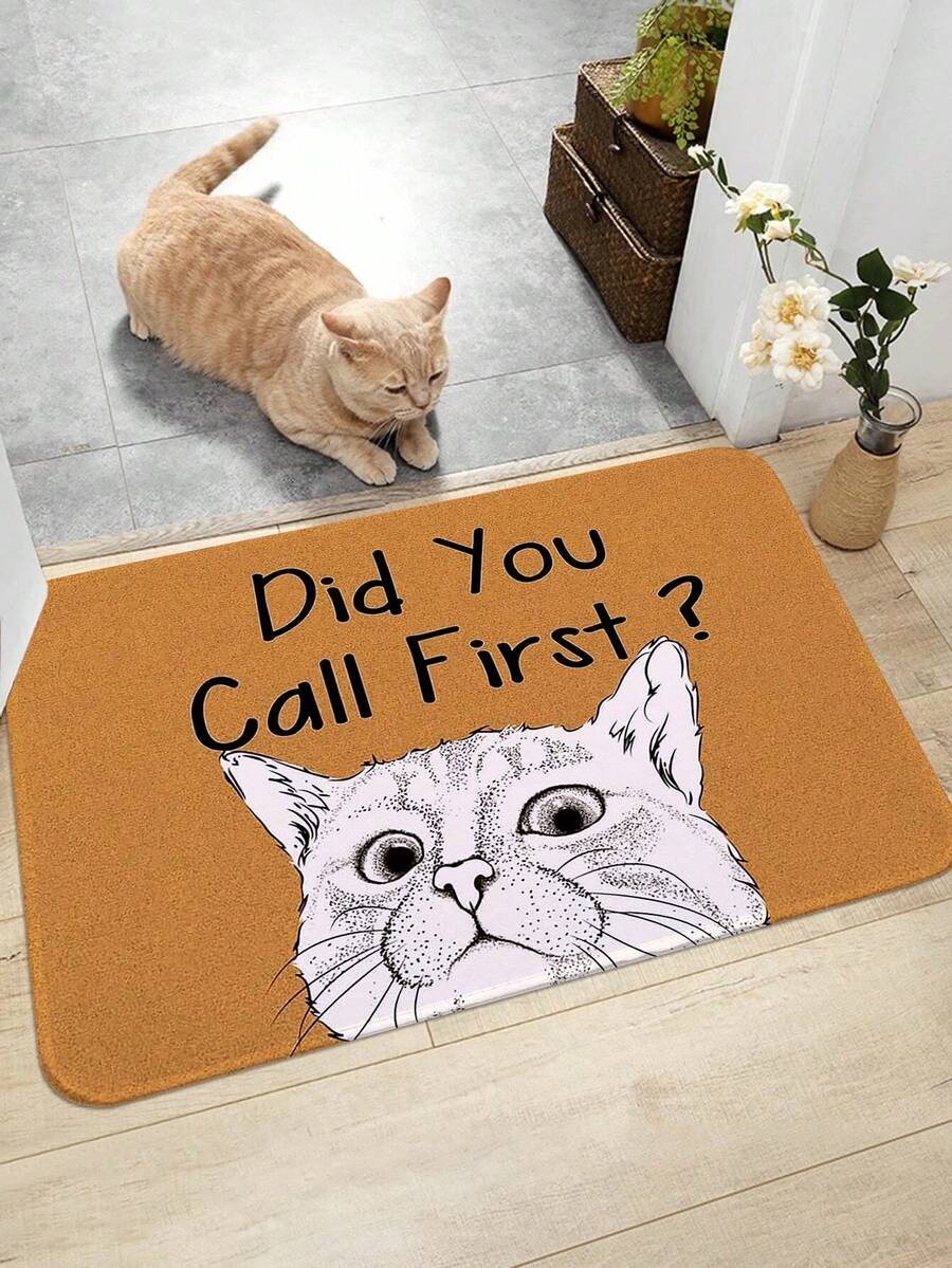 1pc Cute Cat & Words Printed Door Mat, Soft Crystal Velvet Rectangle Anti-Slip Absorbent Floor Mat For Living Room Home Decor