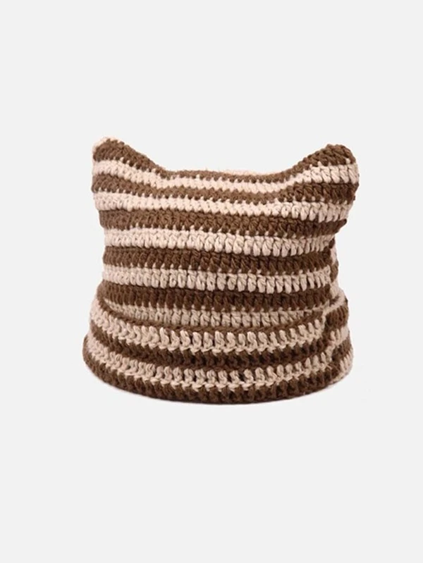 1pc Cute Cat Ears Beanie Hats for Women Striped Korean Fashion Y2K Wool Knitted Streetwear