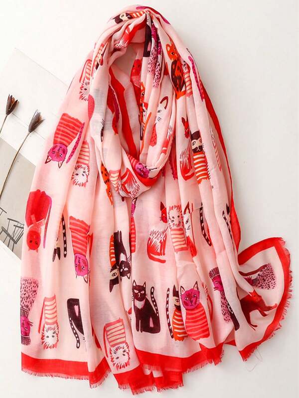 1pc Cute Cat Park Printed Scarf For Women, Autumn & Winter Warm Knitted Neck Warmer, Sunscreen Beach Shawl