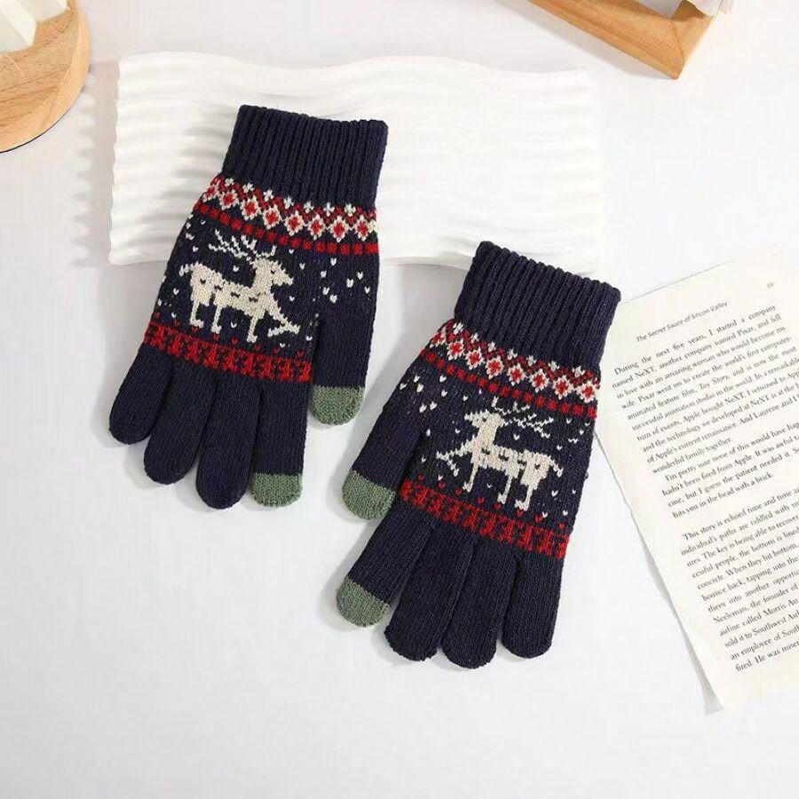 1pc Cute Deer Pattern Thickened And Warm Knit Touchscreen Gloves For Cycling, Unisex