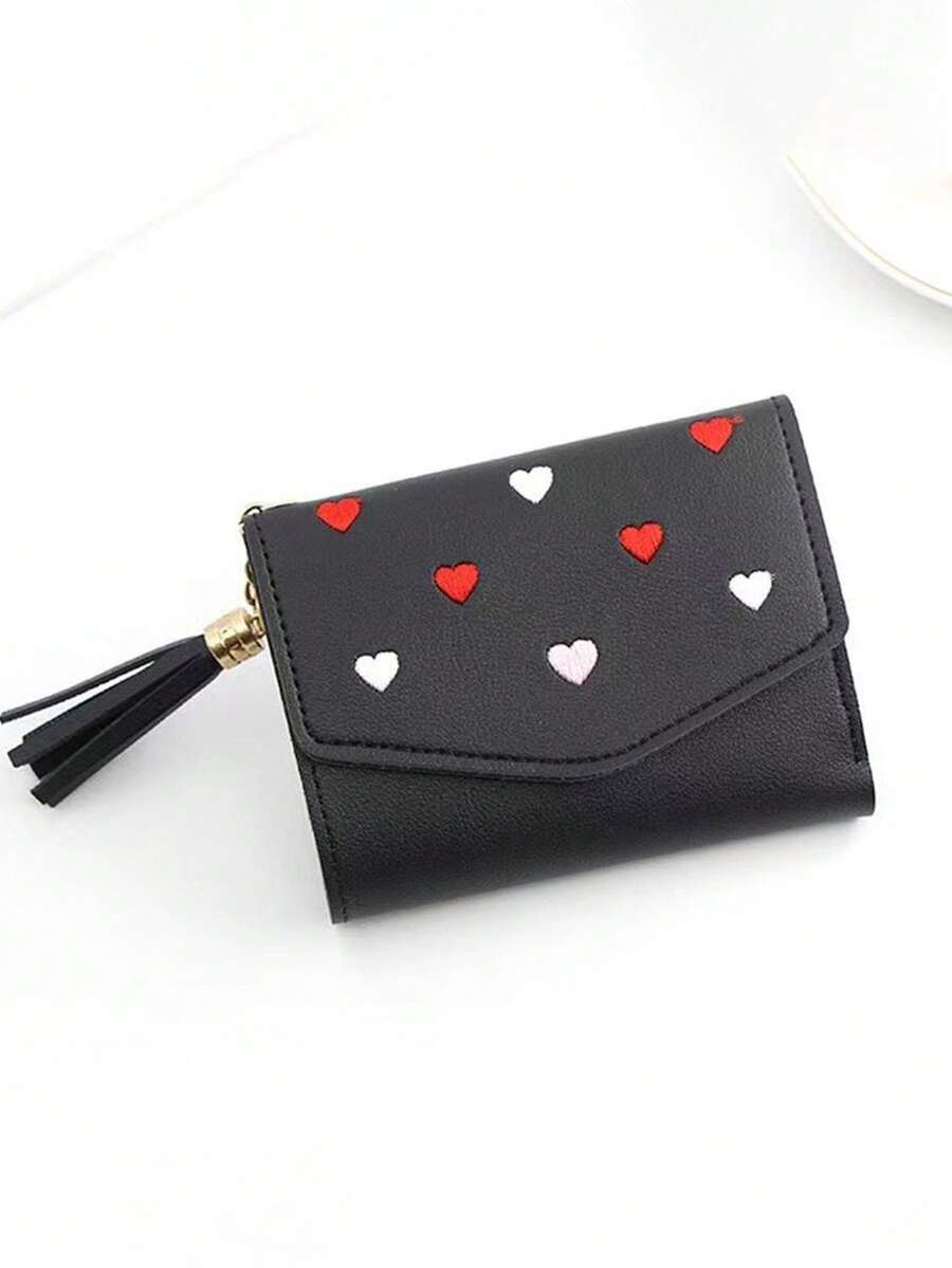 1pc Cute Style Black Short Embroidery Heart Pattern Kids' Three-Folded Coin Purse