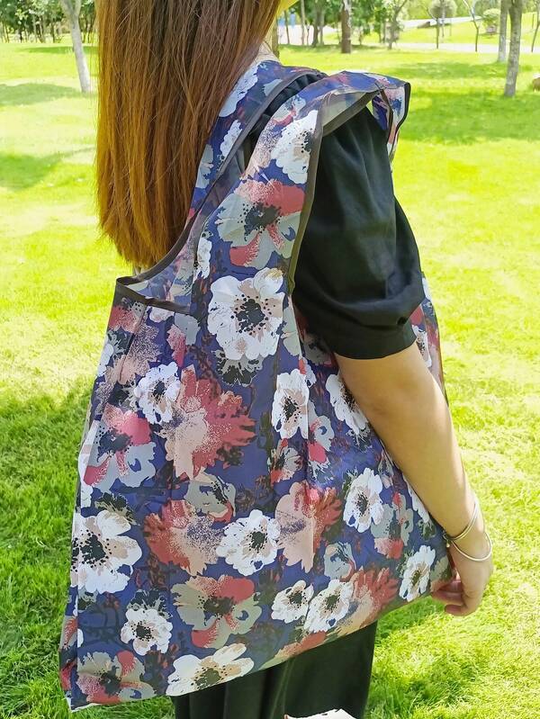 1pc Dark Blue Floral Printed Reusable Shopping Bag, Large Capacity Foldable Packing Bag With Durability And Convenience For Travel, Shopping, And Storage