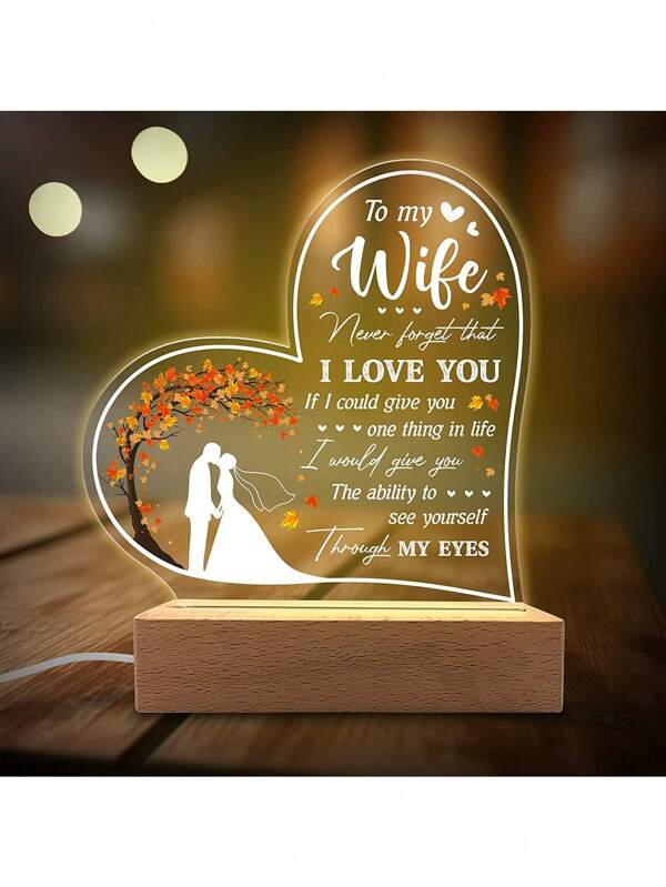 1pc Desktop Heart-Shaped Acrylic Night Light With Wooden Base For Wife, Gift For Valentine'S Day, Anniversary, Birthday, And Christmas From Husband - Never Forget That I Love You