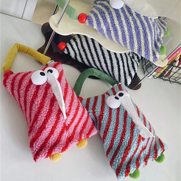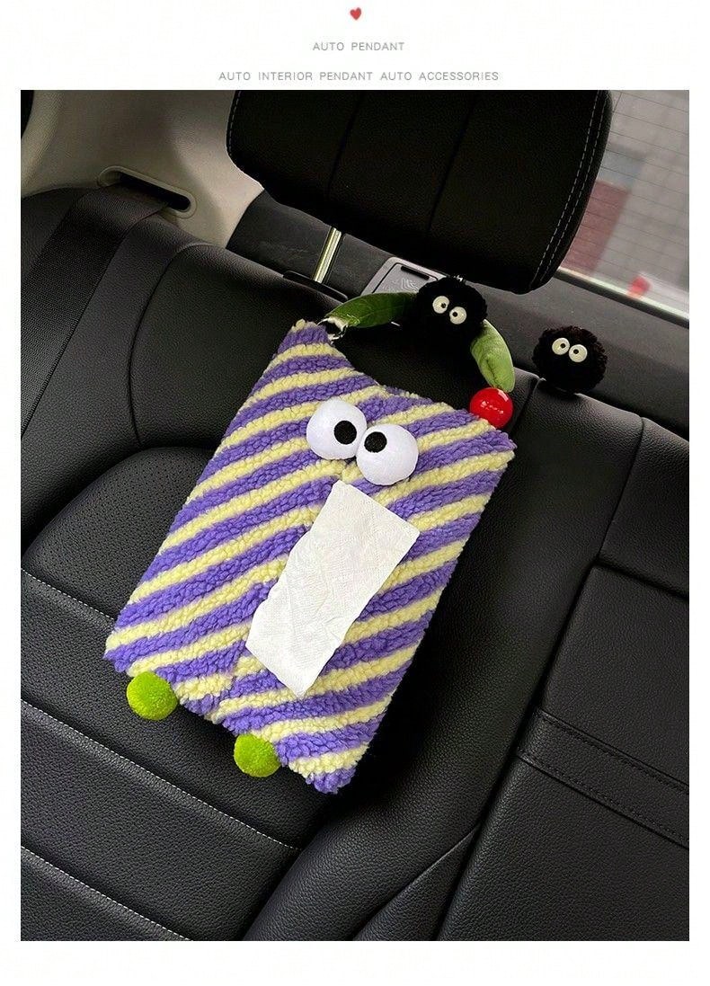 1pc Diagonal Stripe Cute Monster Tissue Box, Hanging Roll Tissue Holder, Car Tissue Dispenser, Portable Tissue Bag