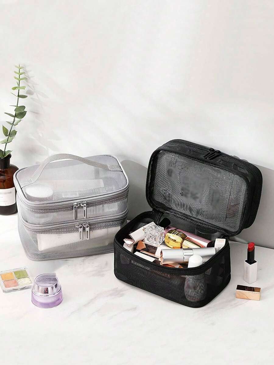 1pc Double Layer Mesh Makeup Bag, High Capacity Portable Travel Toiletry Bag