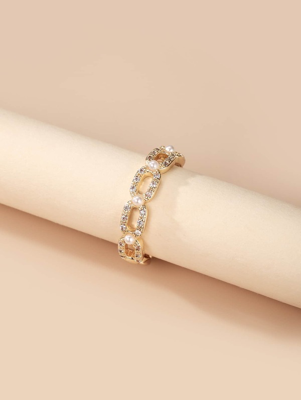 1pc Elegant Gold Plated Ring With Pearl & Cubic Zirconia For Women, Adjustable Size