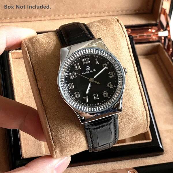 1pc Elegant Quartz Wristwatch For Couple, With Silver 304 Stainless Steel Case, Arabic Numerals, Black Calendar Dial, Genuine Leather Strap, Casual Waterproof Electronic Watch Suitable For Work And Daily Life, High-End Lover/Friendship/Family Gifts
