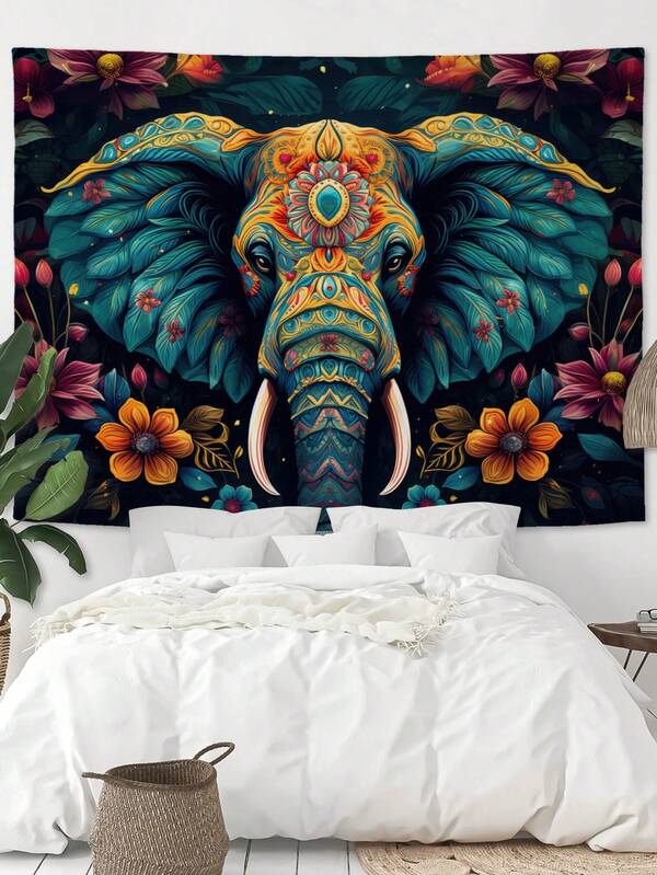 1pc Elephant & Flower Pattern Tapestry, Modern Fabric Print For Home Bedroom Decoration Wall Hanging Textile Wall Art