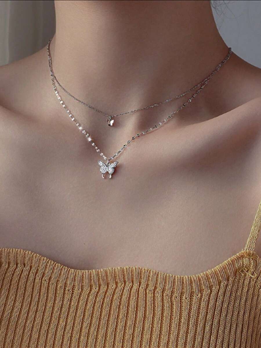 1pc European And American Style Sweet And Fresh Small Design Diamond Butterfly Pendant Double-Layered Necklace