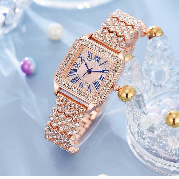 1pc Exquisite, Fashionable & Elegant Ladies' Watch, Rose Gold Stainless Steel Band With Rhinestone Decorated Square Dial Pointer- Suitable For Parties, Dance Balls And Gifting Occasions