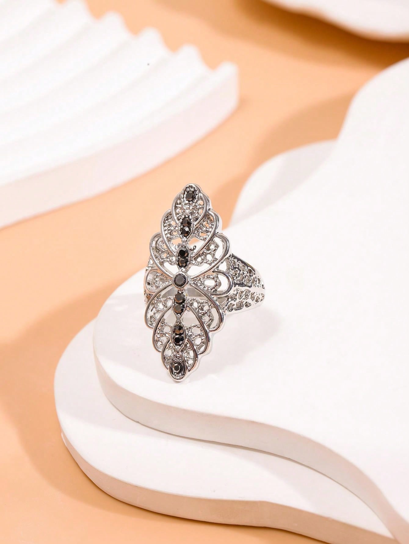 1pc Exquisite Thai Silver Vintage Style Hollow Out Floral Ring For Women, Fashionable Statement Ring, Size 8