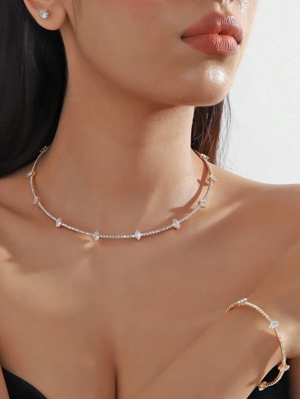 1pc Fashionable & Elegant Bridal Jewelry Set Including Full Rhinestone Bracelet, Sweetheart Full Rhinestone Necklace And A Pair Of Rhinestone Stud Earrings