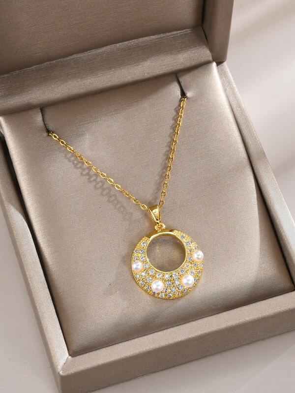 1pc Fashionable Bead Filled Circle & Pearl Pendant Women'S Stainless Steel Necklace For Daily Wear