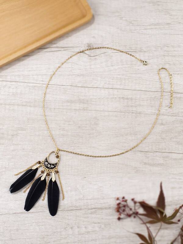 1pc Fashionable Black Feather Tassel Pendant Necklace With Black Oil Drop For Sweater Chain, Vintage Style Creative Personalized Necklace