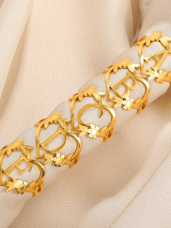 1pc Fashionable Gold Stainless Steel Flower Shaped Open Ring With Letter, Heart For Ladies, Wedding, Jewelry, Valentine'S Day Gift